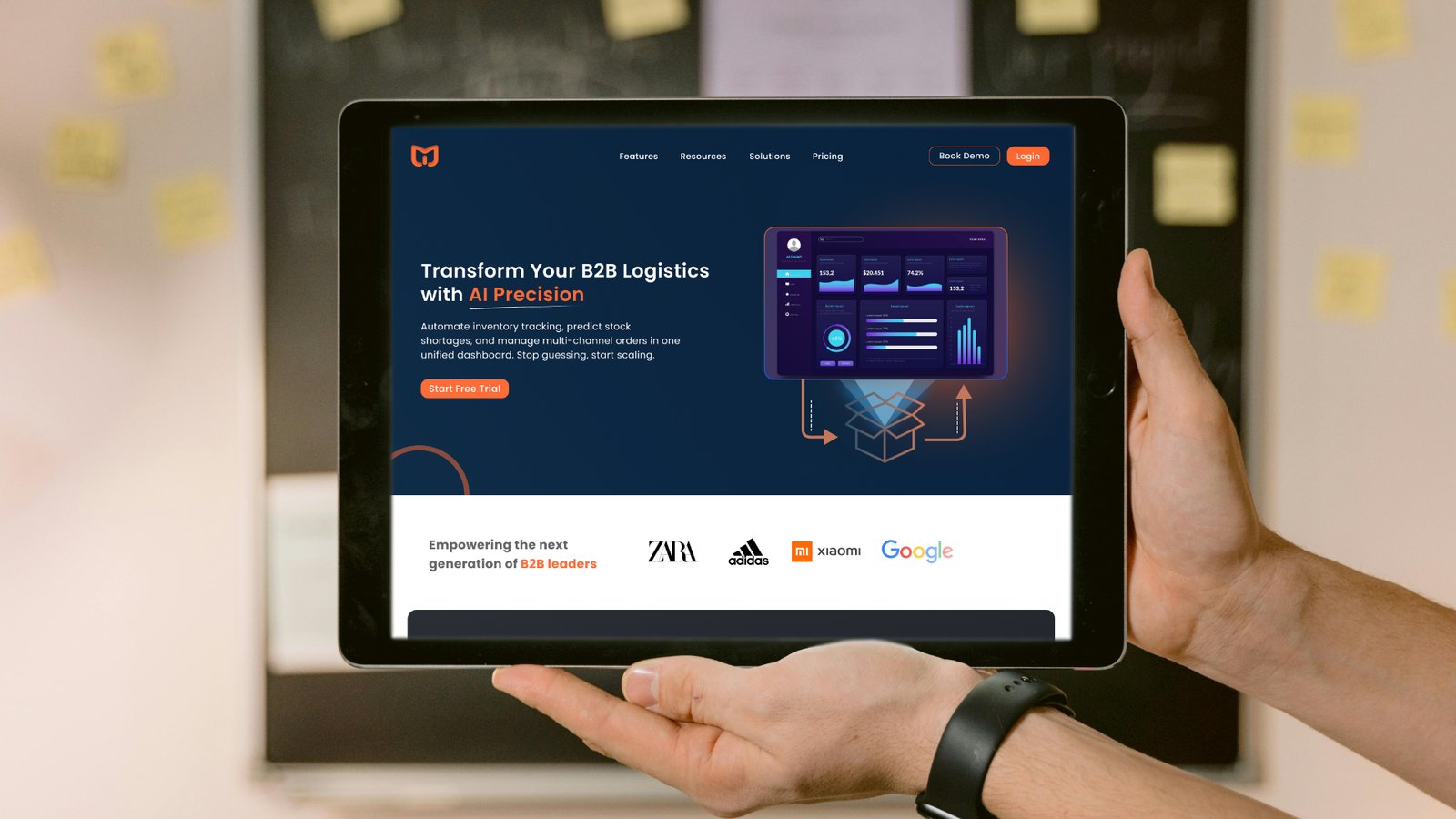 A high-fidelity UI design for a B2B supply chain automation platform. The layout utilizes a modern bento-grid system, custom data visualization, and a high-contrast dark/orange theme to communicate speed and precision.